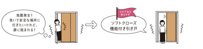 (実用新案取得済み)」、有事に慌てていても指の挟まれ事故を防ぐソフトクローズ機能付きの引き戸など、住まいの細部に至るまでこだわりが詰まっています。また、ピアキッチンプランでは、パントリーを採用するなど、ローリングストックの活用を促すことで、減災につなげます。