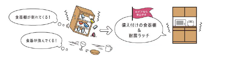 ① 地震で家具が倒れてくる危険を防ぐ備え付けの食器棚を標準で採用。また食器棚の扉には食器類の飛び出し