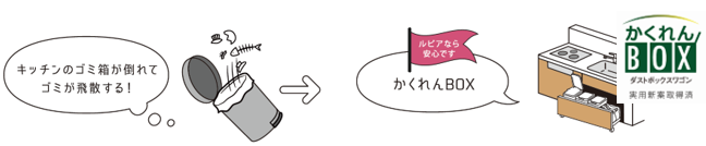 家具転倒の危険を防ぐ備えつけの食器棚や棚扉の耐震ラッチ、ゴミの飛散を防ぐシンク下の収納「かくれんBOX