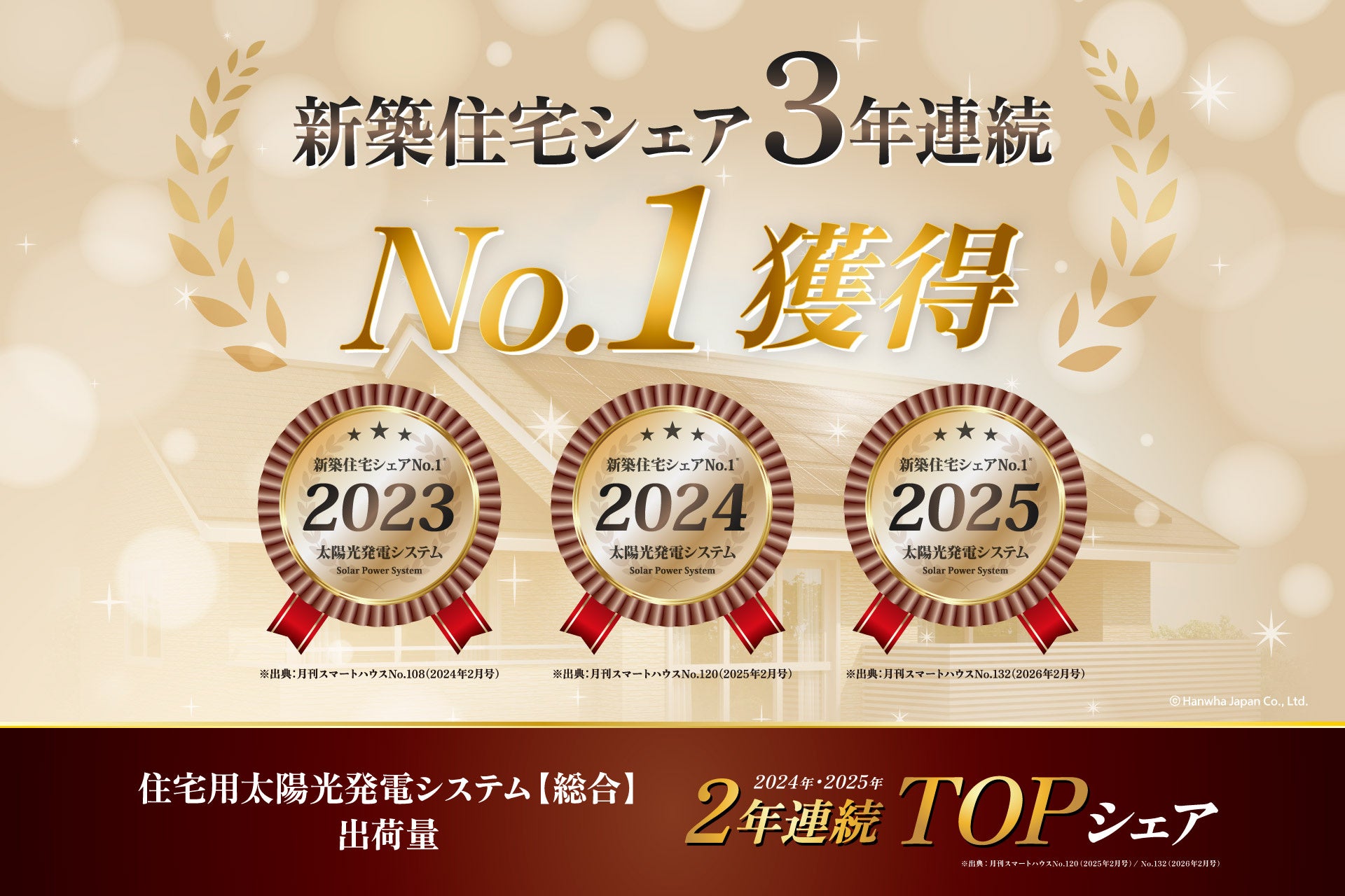 また、2025年度の新築住宅向け市場における国内出荷シェアにおいて、住宅用太陽光発電システムメーカーとして3年連続でNo.1※¹を獲得しました。既築住宅を含む住宅総合市場においても、2年連続でトップシェア※¹を達成しました。