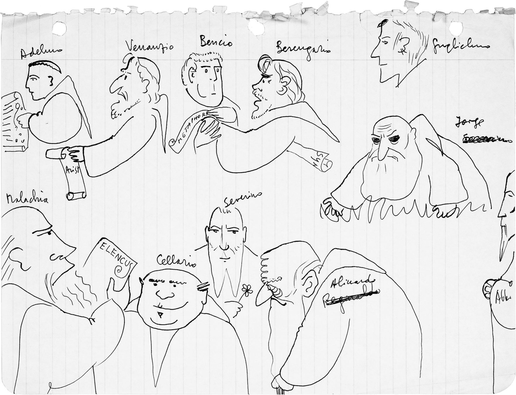映画監督がコンテ絵を描くように、エーコ自身も登場人物のイメージスケッチ、中世の生活関連のスケッチ、文書館の図面などを描いていました。