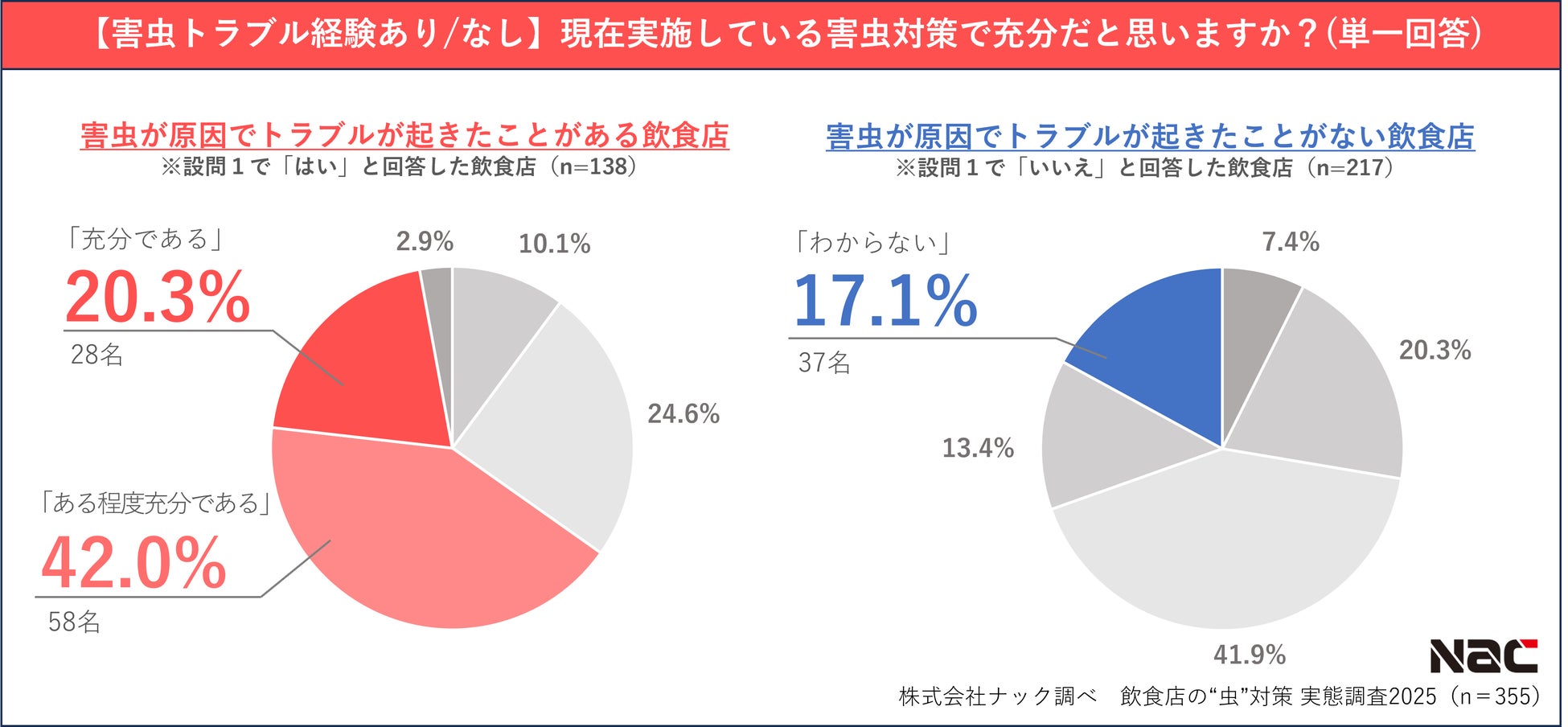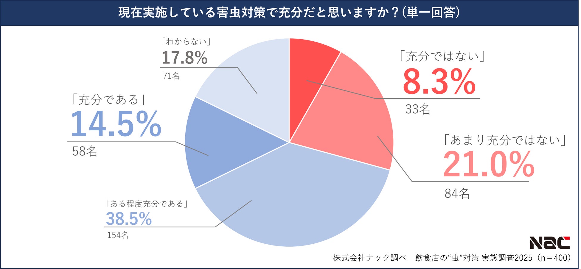 害虫トラブルを経験した飲食店は「充分である」「ある程度充分である」との回答が約60%と、対策に注力