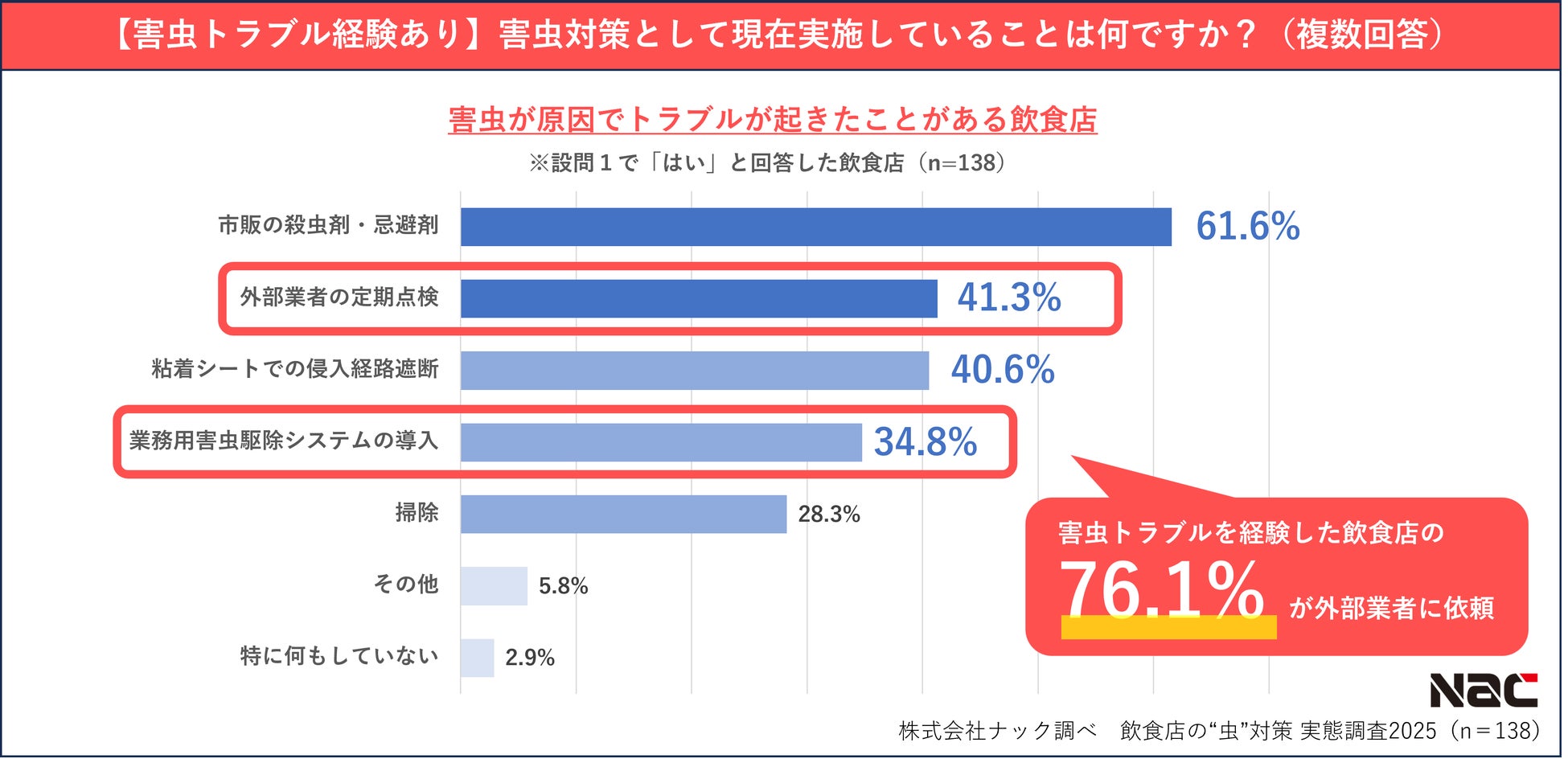 2. 飲食店で最も実施されている害虫対策は、「市販の殺虫剤・忌避剤」の使用。害虫トラブルを経験した飲食店の76.1%が「外部業者の点検」や「害虫駆除システム」を活用