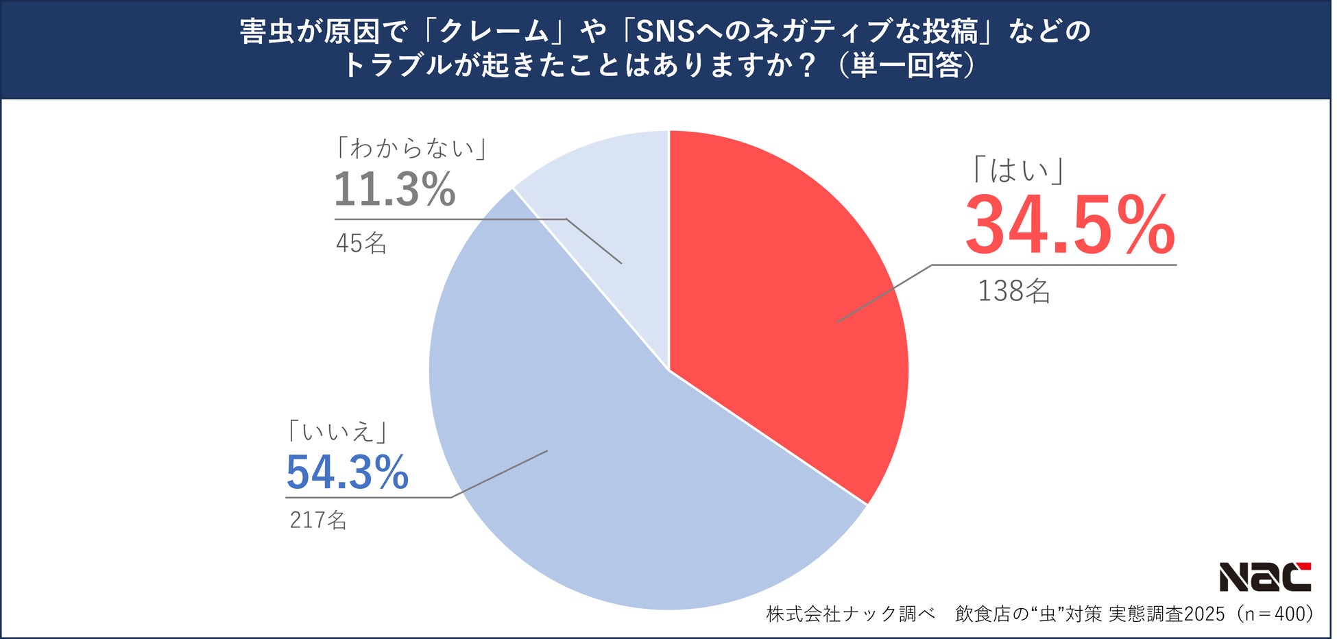 害虫が原因で「クレーム」や「SNSへのネガティブな投稿」などのトラブルが起きたことがあるか聞いたところ、34.5%が「はい」と回答しました。およそ3店に1店が害虫によるトラブルを経験していることになります。