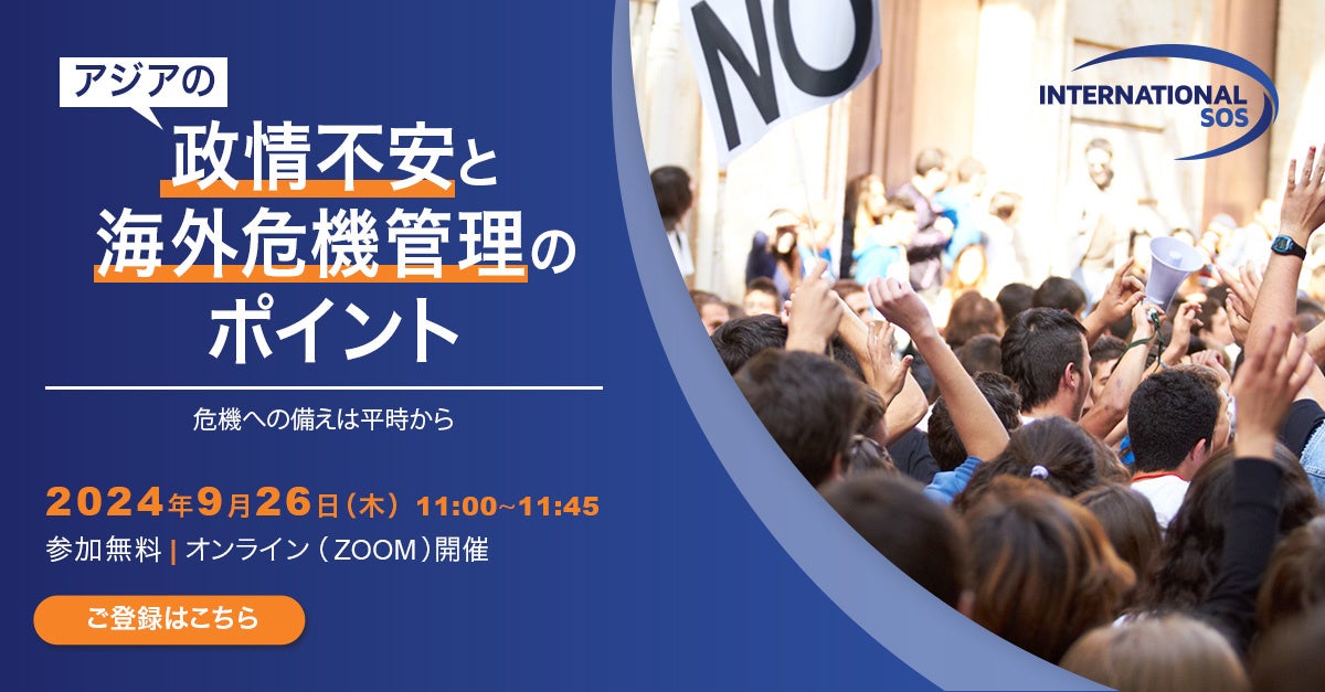 世界中で働く従業員の健康と安全を支えるインターナショナルSOS(日本法人本社:東京都港区 代表取締役 マーク・アタウェイ)は、年初のセミナーにてご紹介した「リスク展望2024」のフォローアップウェビナーを開催いたします。