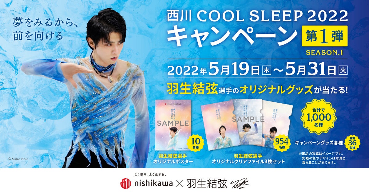 西川株式会社は、フィギュアスケーターの羽生結弦選手をイメージキャラクターに起用した『西川 COOL SLEEP 2022 キャンペーン』を5月19日(木)から開催します。今年は、実店舗と西川公式オンラインショップとで異なる期間・内容で行います。全国の百貨店や家具店、寝具専門店などの実店舗は、梅雨から夏にかけて全4回開催予定で、 第1弾SEASON.1を5月19日(木)〜5月31日(火)の期間で実施します。西川公式オンラインショップ[https://shop.nishikawa1566.com/shop/default.aspx]は全3回開催予定で、 第1弾を5月19日(木)〜5月23日(月)の期間で実施します。