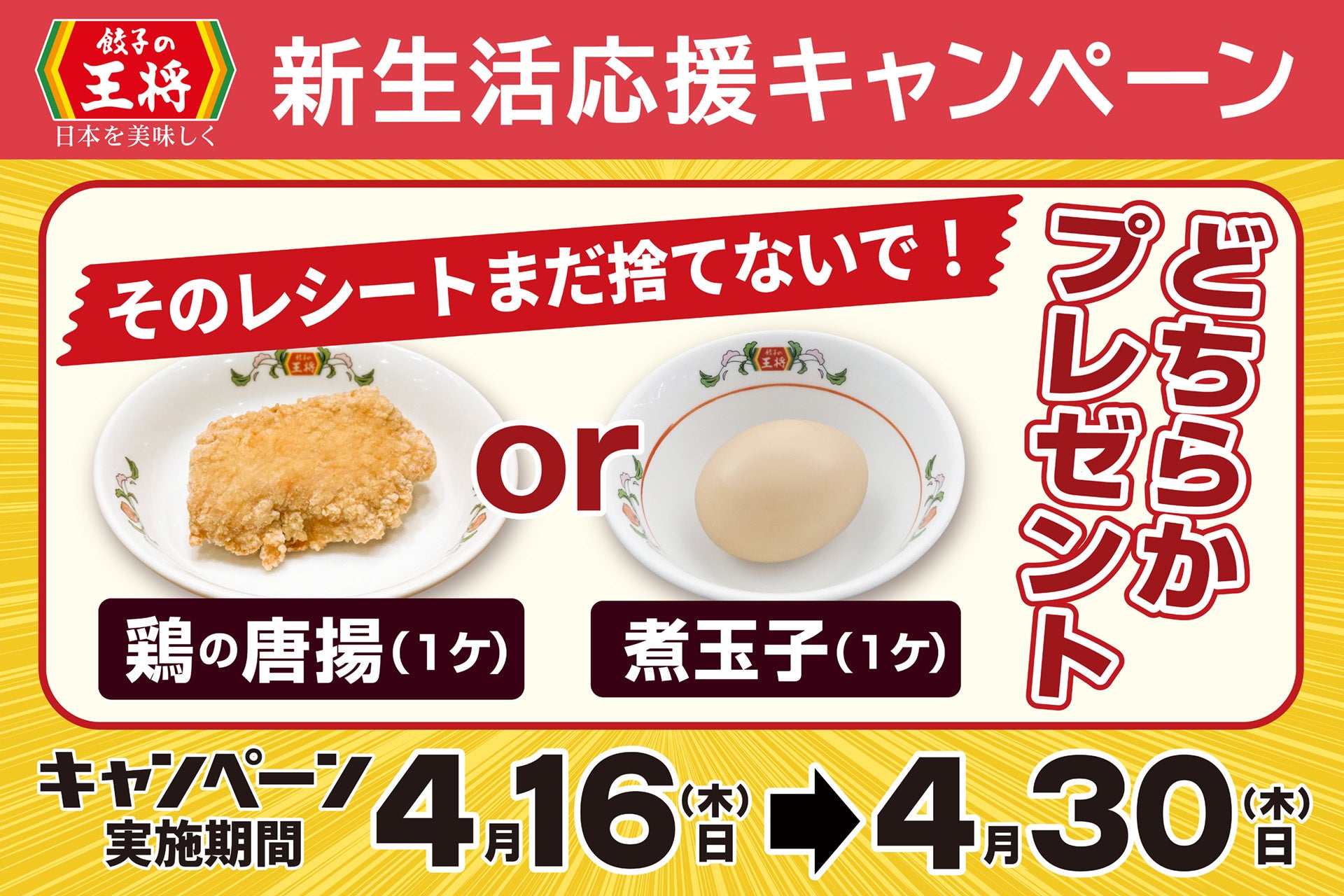 d11353-204-b3a18c7dc09886f253143a4efb40d3ba.pdf株式会社王将フードサービス(本社 京都府京都市 代表取締役社長 渡邊直人)は、新生活が始まるこの時期に、餃子の王将でのお食事をより気軽にお楽しみいただけるよう、「新生活応援キャンペーン」として、2つのお得な企画を実施いたします。