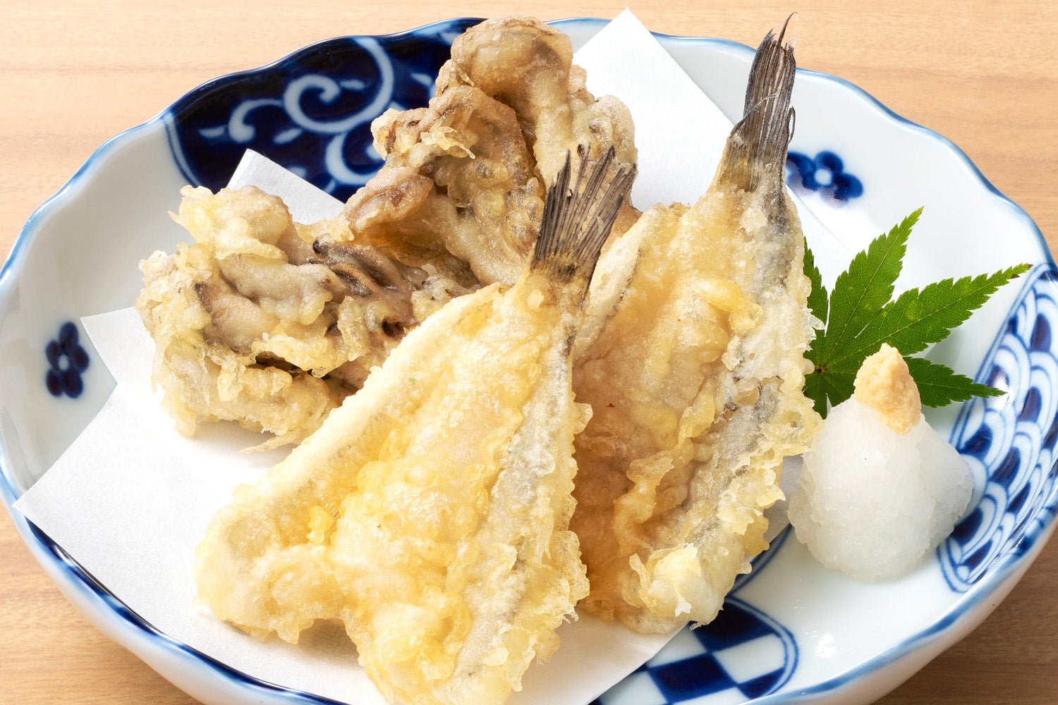 「ハゼと舞茸 天布羅盛り合わせ(480円)」にもご注目あれ。江戸前天ぷらの定番であるハゼは秋から冬にかけて脂が乗ります。ハゼの柔らかい白身の食感と上品な甘味を引き立たせるように板前が軽やかに揚げ、香り豊かな舞茸の天ぷらと共に提供。すっきりとした日本酒と一緒に合わせるのがオススメです。