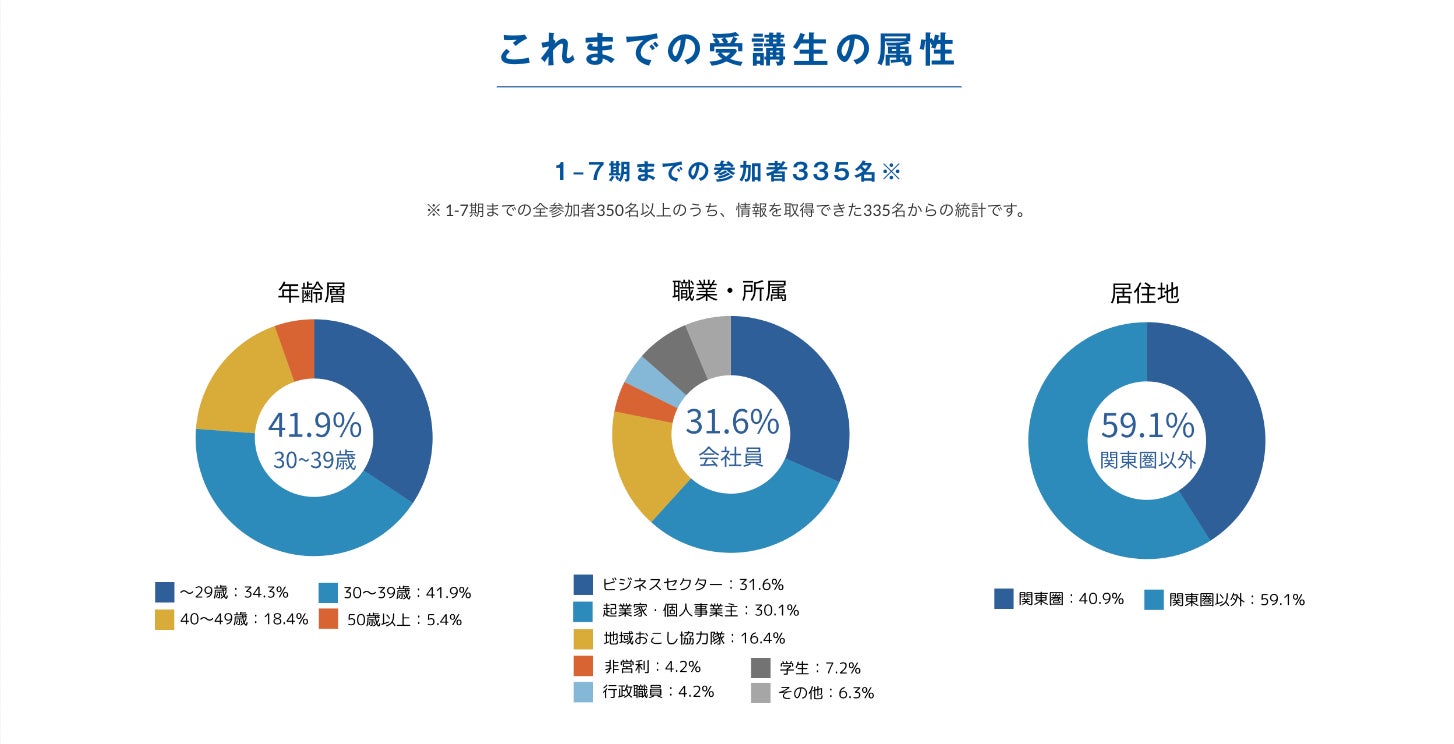 参加者の属性は、起業家、個人事業主、地域おこし協力隊、団体職員、都市部大企業・ベンチャー企業・地方の中小企業の会社員、自治体職員、研究者など多様。30代が41.9%。これまでに100地域以上、そのうち59.1%が関東圏以外から参加しています。