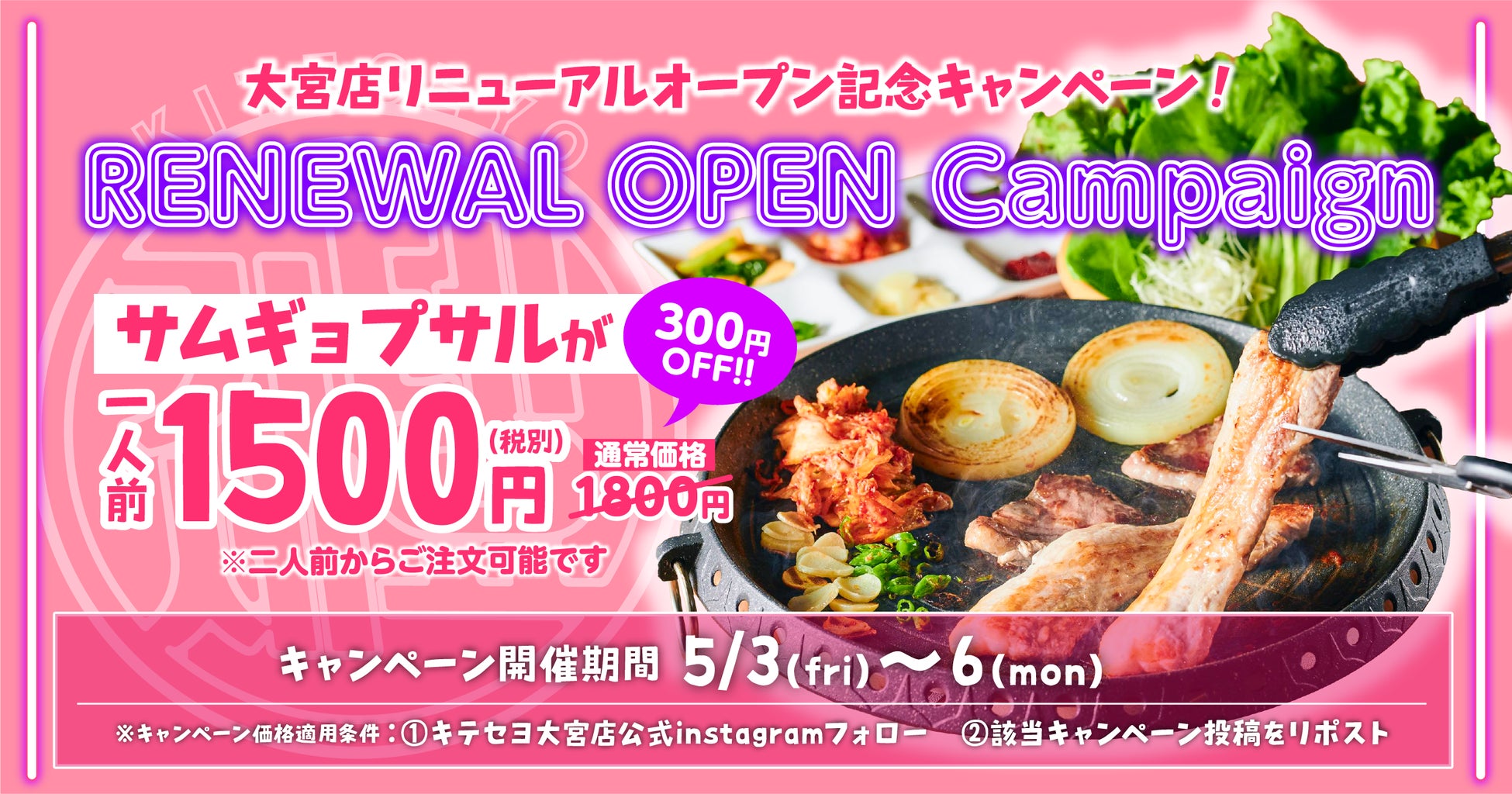 リニューアルオープンキャンペーン!5月3日~6日までの4日間、定番人気メニューのサムギョプサルが300円OFF!