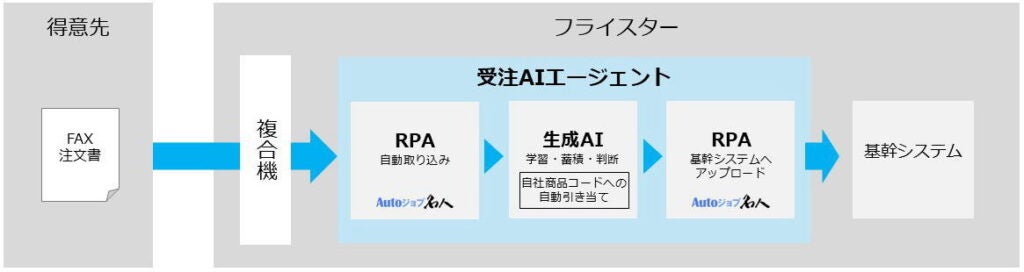 業務プロセスの自動化・効率化を支援するユーザックシステム株式会社(本社:大阪市、代表取締役社長:小ノ島 尚博、以下当社)は、パン粉業界のリーディングカンパニー、フライスター株式会社(本社:横浜市、代表取締役社長:関 全男、以下フライスター)とともに、人手不足や働き方改革に対応するため、受注業務の完全自動化を目指し、AIエージェントとRPAを組み合わせたソリューション『受注AIエージェント』による実証実験を実施しました。