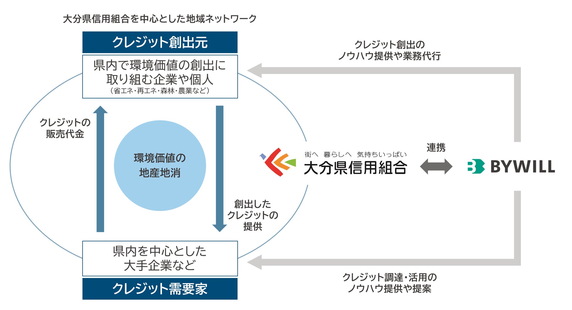 そこで、地域の中小企業や個人事業主等と密接な関係を築いている大分県信用組合と連携することにより、地域の組合員のネットワークと、バイウィルがもつ環境価値に関する各種サービスと結集させ、大分県のカーボンニュートラル実現をともに目指すことになりました。