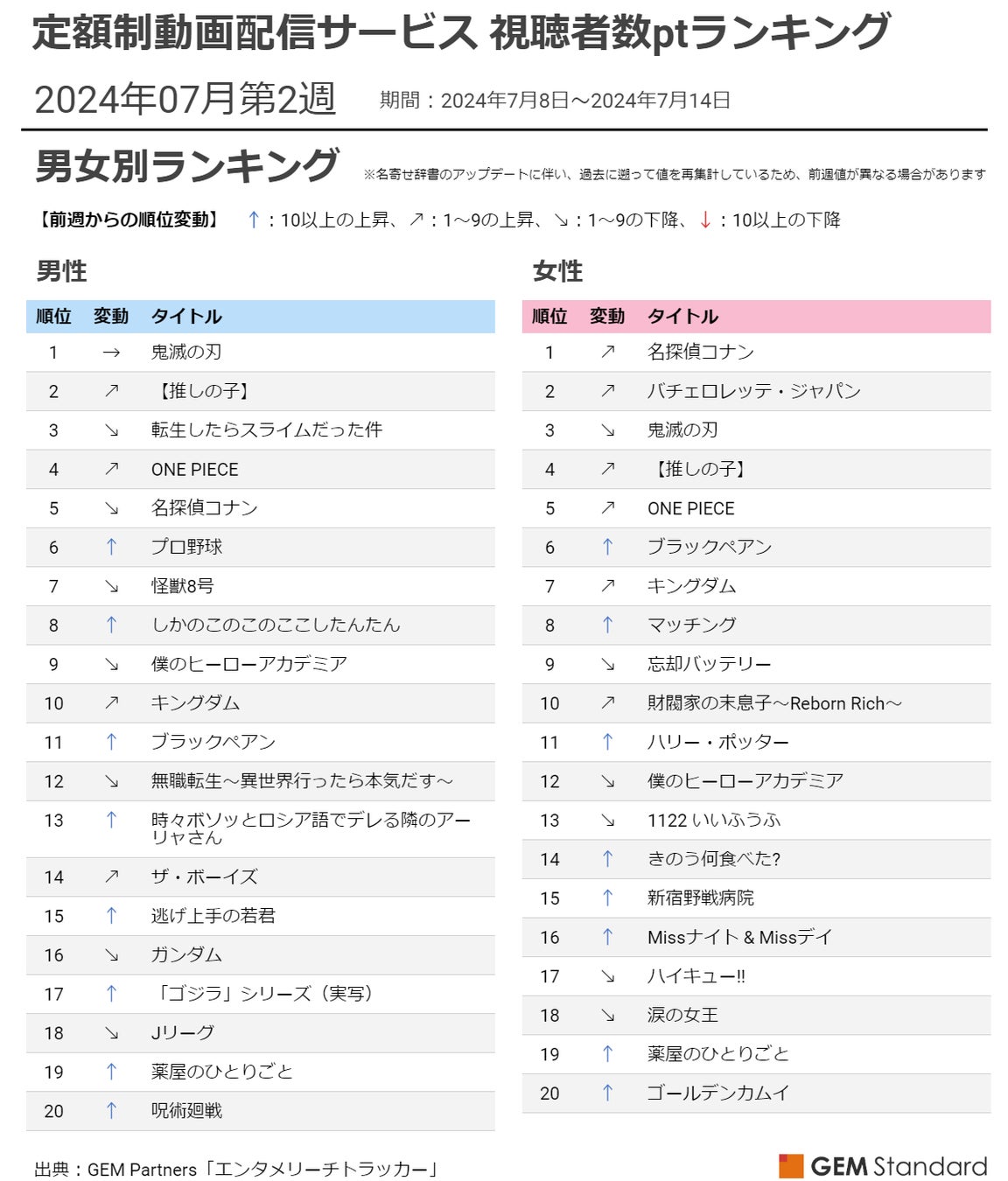 エンタテイメント業界に向けたデータ×デジタルマーケティングサービスを提供するGEM Partners株式会社(ジェムパートナーズ、所在地:東京都港区、代表取締役:梅津文)は7月17日、複数の定額制動画配信サービスを横断集計した2024年7月第2週(2024年7月8日~2024年7月14日)のコンテンツ別(※1)視聴者数ptランキング(全体・男性・女性)を発表します。