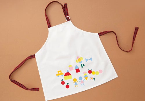 〇、△、□のパーツから好きな形を組み合わせ、オリジナルのモチーフをデザインしよう。組み合わせは無限大。デザインしたモチーフをプレス機でプリントして、自分だけのエプロンをつくってみよう。