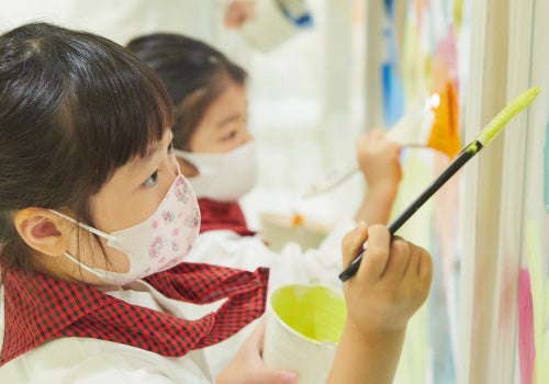 ガラスをおおきなキャンバスに見立て、思いっきりペインティング。体を動かして絵を描くはじめての体験で、気分はアーティスト!みんなで協力しながら作品を仕上げることで、協調性・社会性が育まれます。