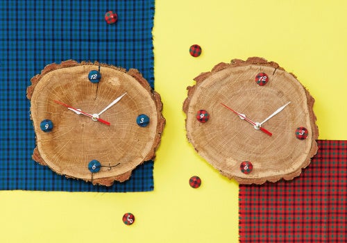 木のあたたかみを感じながら、オリジナルの時計をつくってみよう。手作りのくるみボタンを文字盤に貼り付けて、自分だけのお気に入りの時計が完成!