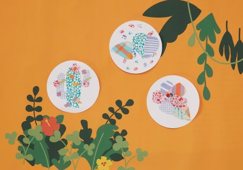 色鉛筆やお洋服に使用している生地などを使って、ハイビスカスや葉っぱ、サボテンを描こう!