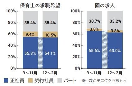 保育士バンク!の利用実績をもとに、直近3か月の保育士求職者の希望と園の募集要件で、正社員・契約社員・パートの雇用形態の割合を算出、 前期間と比較。