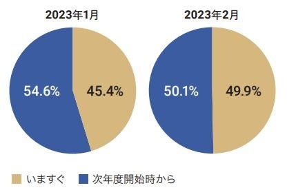 保育士バンク!の利用実績をもとに、当月の園の募集要件で、入職する タイミングが「いますぐ」なのか「次年度開始時」なのかの割合を算出、 前月と比較。