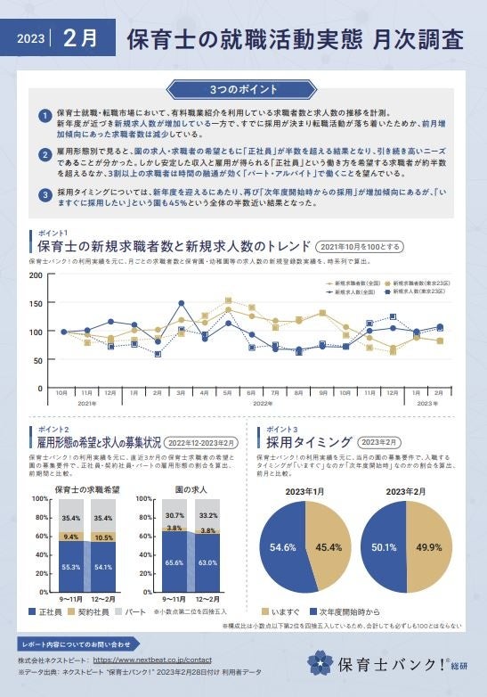 | ~ 3つのポイント ~ 1.保育士就職・転職市場において、有料職業紹介を利用している求職者数と求人数の推移を計測。 新年度が近づき新規求人数が増加している一方で、すでに採用が決まり転職活動が落ち着いたためか、前月増加傾向にあった求職者数は減少している。 2.雇用形態別で見ると、園の求人・求職者の希望ともに「正社員」が半数を超える結果となり、引き続き高いニーズであることが分かった。しかし安定した収入と雇用が得られる「正社員」という働き方を希望する求職者が約半数を超えるなか、3割以上の求職者は時間の融通が効く「パート・アルバイト」で働くことを望んでいる。 3.採用タイミングについては、新年度を迎えるにあたり、再び「次年度開始時からの採用」が増加傾向にあるが、「いますぐに採用したい」という園も45%という全体の半数近い結果となった。 |