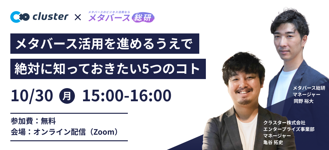 10/30(月)国内最大級のメタバースプラットフォーム「cluster」を運営するクラスター株式会社亀谷×メタバース総研岡野氏による「メタバース活用セミナー」開催!