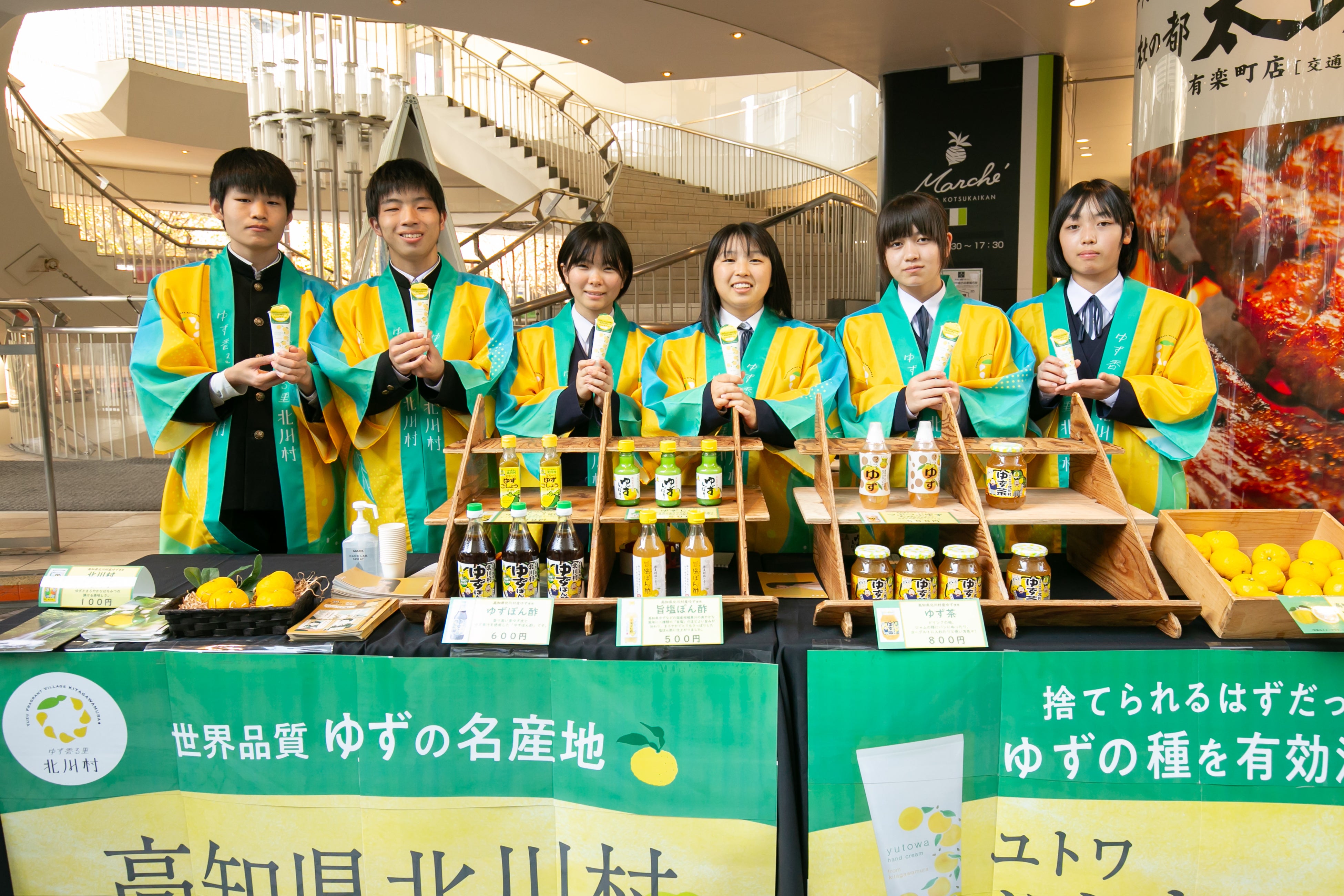 本イベントは、全国の人に北川村ゆずの魅力を伝え、過疎に悩む北川村を盛り上げることを目的に開催いたしました。生徒さんたちは、全国各地の特産品が集まる「交通会館マルシェ」にブースを構え、ゆずぽん酢やゆずサイダーなど、北川村の物産品を販売しながら、北川村の魅力を伝えました。