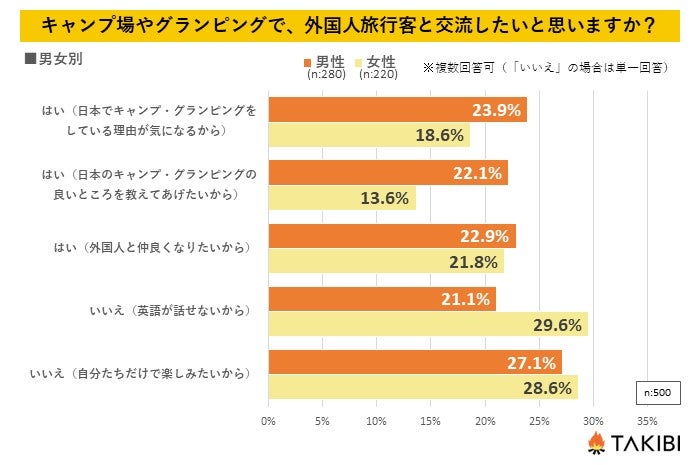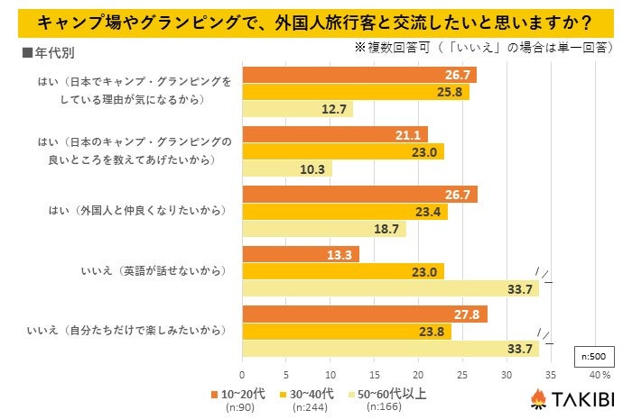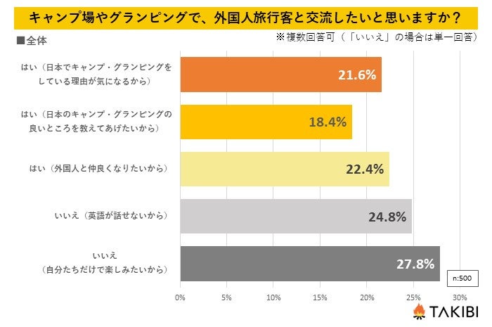 グランピングに行ったことがある・興味がある10代~60代の男女を対象とした「キャンプ場やグランピング施設で、外国人旅行客と交流したいと思いますか?」というアンケートを行ったところ、「はい」の回答で多かった理由順に、外国人と仲良くなりたいから(22.4%)、日本でキャンプ・グランピングしている理由が気になるから(21.6%)、日本のキャンプ・グランピングのいところを教えてあげたいから(18.4%)という結果になりました。