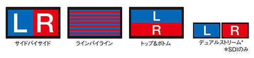 4KおよびHD 解像度の3D映像が表示可能です。SDI(12G/3G)2系統、SDI(3G)1系統、Display Port、HDMI、DVI-Dの各種端子を装備しており、さまざまな伝送方式の3D信号に対応しています。サイドバイサイド、ラインバイライン、トップ&ボトムの各方式のほか、SDI(12G/3G)2系統はHDデュアルストリーム入力に対応します。『LMD-XH550MT』のみ、4Kデュアルストリームの3D表示に対応しています。
