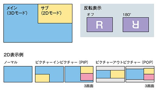 メイン画面に3Dを表示しながら、サブ画面に2DをPIP(ピクチャーインピクチャー)で表示することが可能です。また、180°反転時にも3D表示を維持することができます。2D表示時にはサブ画面2つのPIP/POP(ピクチャーアウトピクチャー)も可能になります。