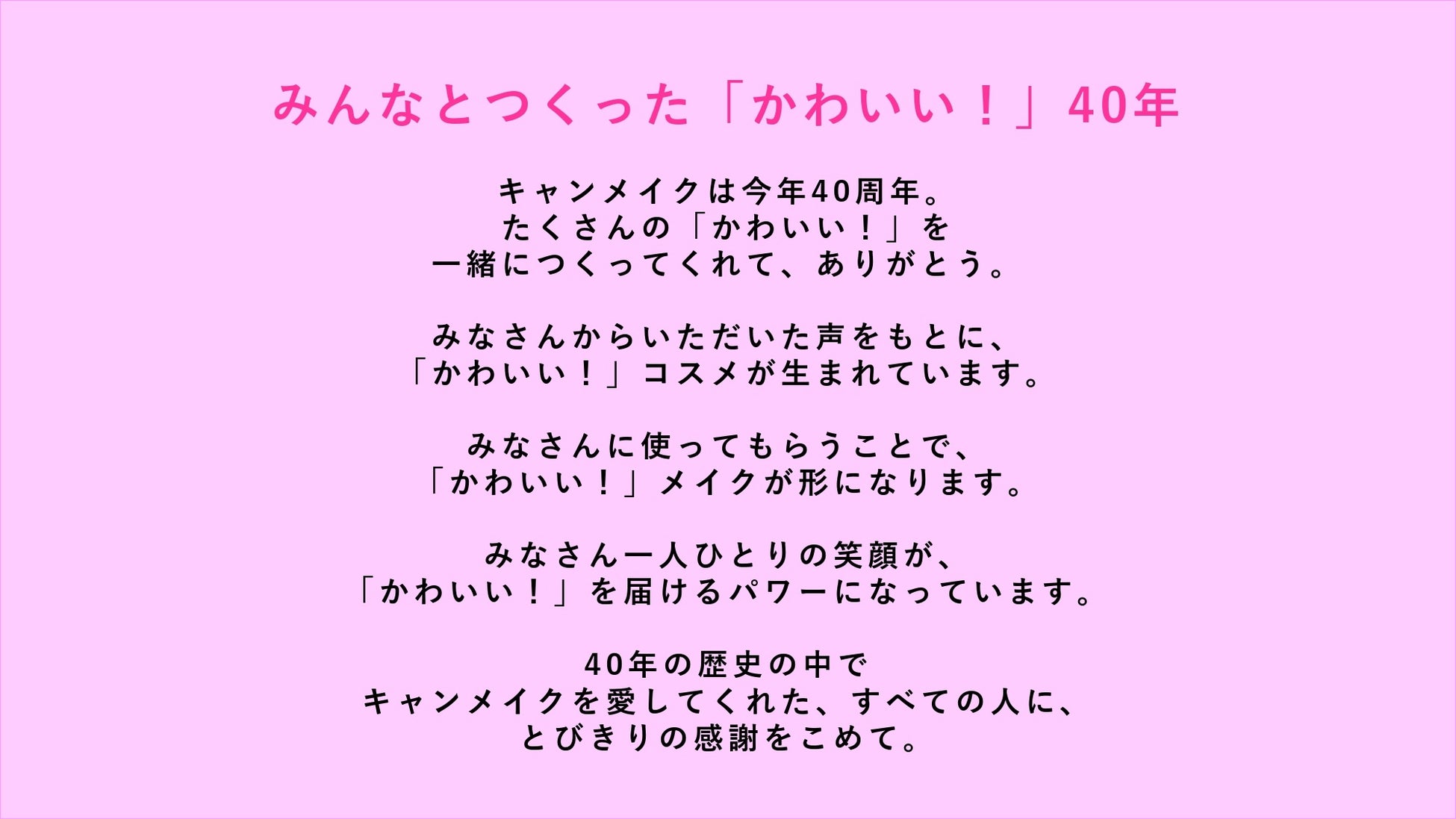 40周年を迎えたキャンメイクは、これからもずっと皆さまの「かわいい」「楽しい」「ときめき」に寄り添い、全力で応援するブランドであり続けたいと願っています。