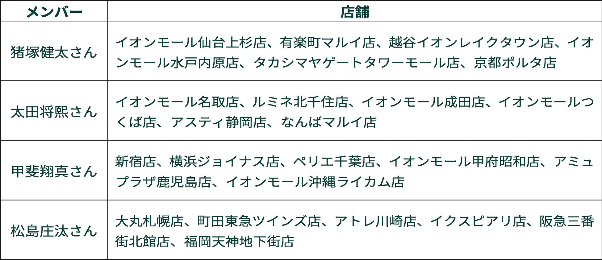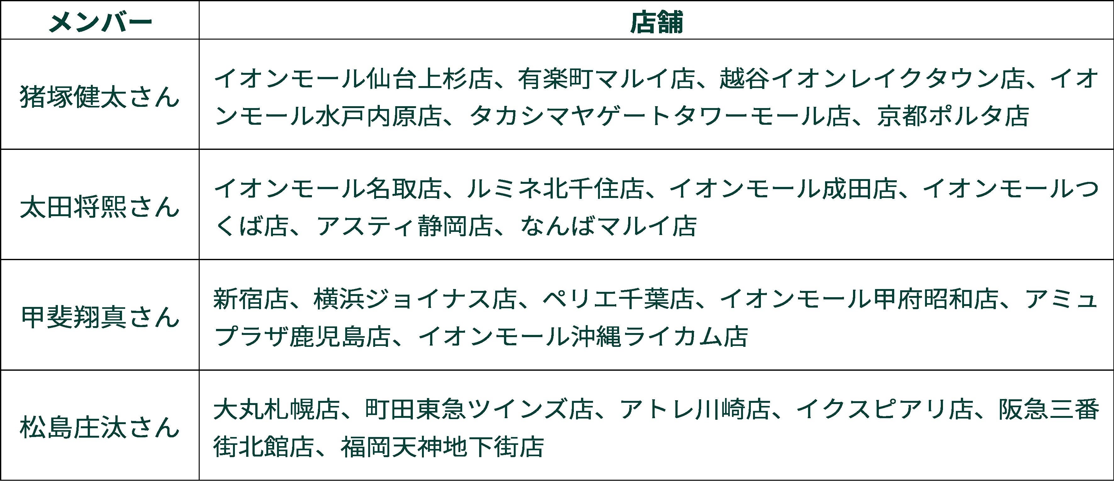 キャンペーン期間中、一部対象店舗でメンバー4人それぞれの選んだアイテムのおすすめポイントなどを収録したコメント映像を放映いたします。対象店舗は以下です。