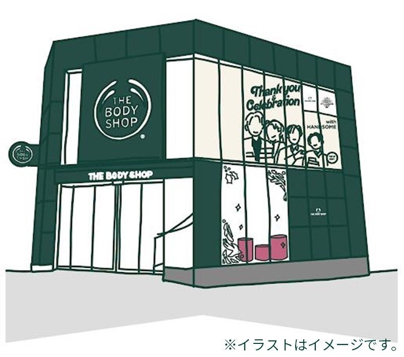 キャンペーン期間中、ザボディショップ渋谷店2階フロアをチーム・ハンサム!仕様にラッピング。2階窓一面をスーツ姿のメンバーが飾り、フロア内には特大パネルをはじめ、撮影時のオフショットチェキや、メンバー4名の等身大パネルなど、ここでしか見ることのできない展示も。メンバーへのメッセージボードも設置いたします。
