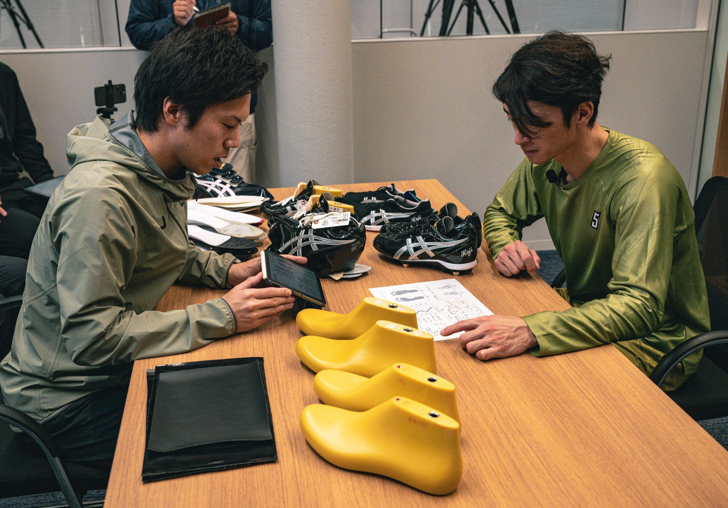 近本選手専用のラスト(靴型)を作製し、本人の足と一体化する構造を追求しました。金具刃と樹脂スタッドを適所に配置したハイブリッド構造の靴底で、バッティングや走塁時にグリップ力が必要となる箇所に金具刃を付け、選手のパフォーマンスをサポートします。また、樹脂スタッドを付けることで突き上げ感を緩和させるなど足にかかる負担を軽減しています。