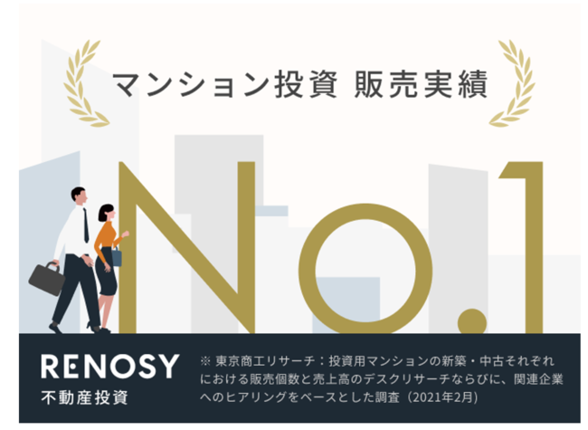 RENOSYの不動産投資は、都市部の中古コンパクトマンションを主力としており、 2021年2月に東京商工リサーチが行った調査では、昨年から2年連続で中古マンション投資における販売実績全国No.1を獲得。新築も含めたマンション投資における販売実績でも、今年初めて全国No.1を獲得しました(※1) 。
