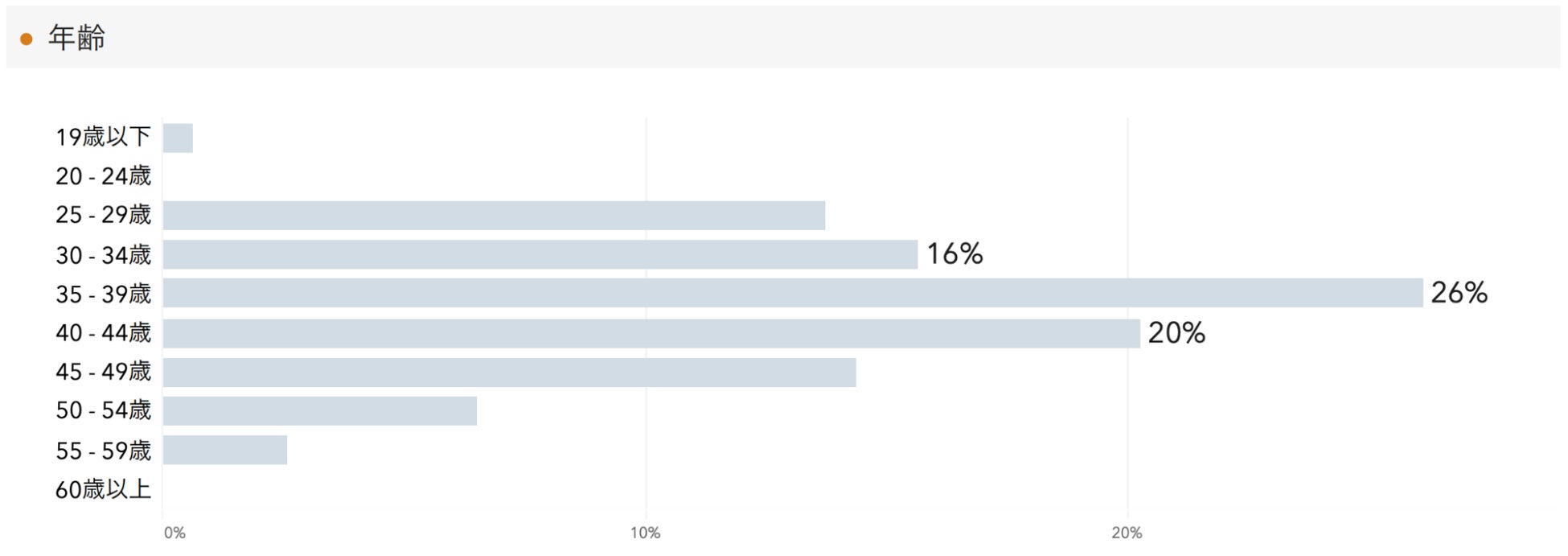 最も割合の多い年齢帯は35〜39歳で26% (前月比7ptアップ) 、次に多い割合は40〜44歳の20% (前月比2ptダウン) 、続いて30〜34歳の16% (前月比6ptダウン)となっております。35~39歳の割合は、2021年7月度に並び過去最高を記録しております。