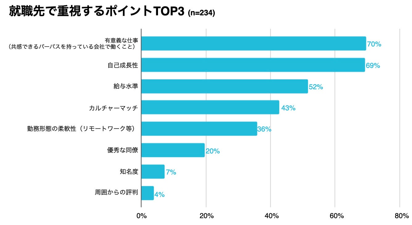 学生に就職活動の際に重視するポイントを聞いたところ、「共感できるパーパスを持っている会社で働くこと(70%)」、「自己成長性(69%)」、「給与水準(52%)」が上位にあがりました。