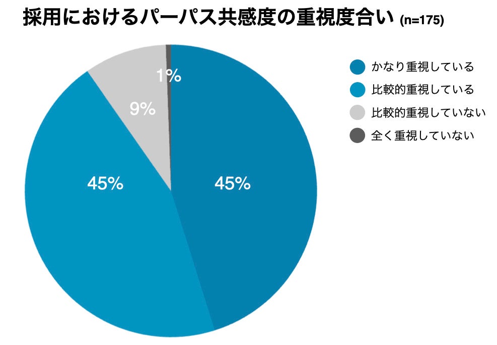 パーパスを定義している企業に、選考時のパーパスの重視度合いについて聞いたところ「かなり重視している(45%)」「比較的重視している(45%)」「比較的重視していない(9%)」「全く重視していない(1%)」となり、ほぼすべての企業がパーパスへの共感度を重視しているという結果に。