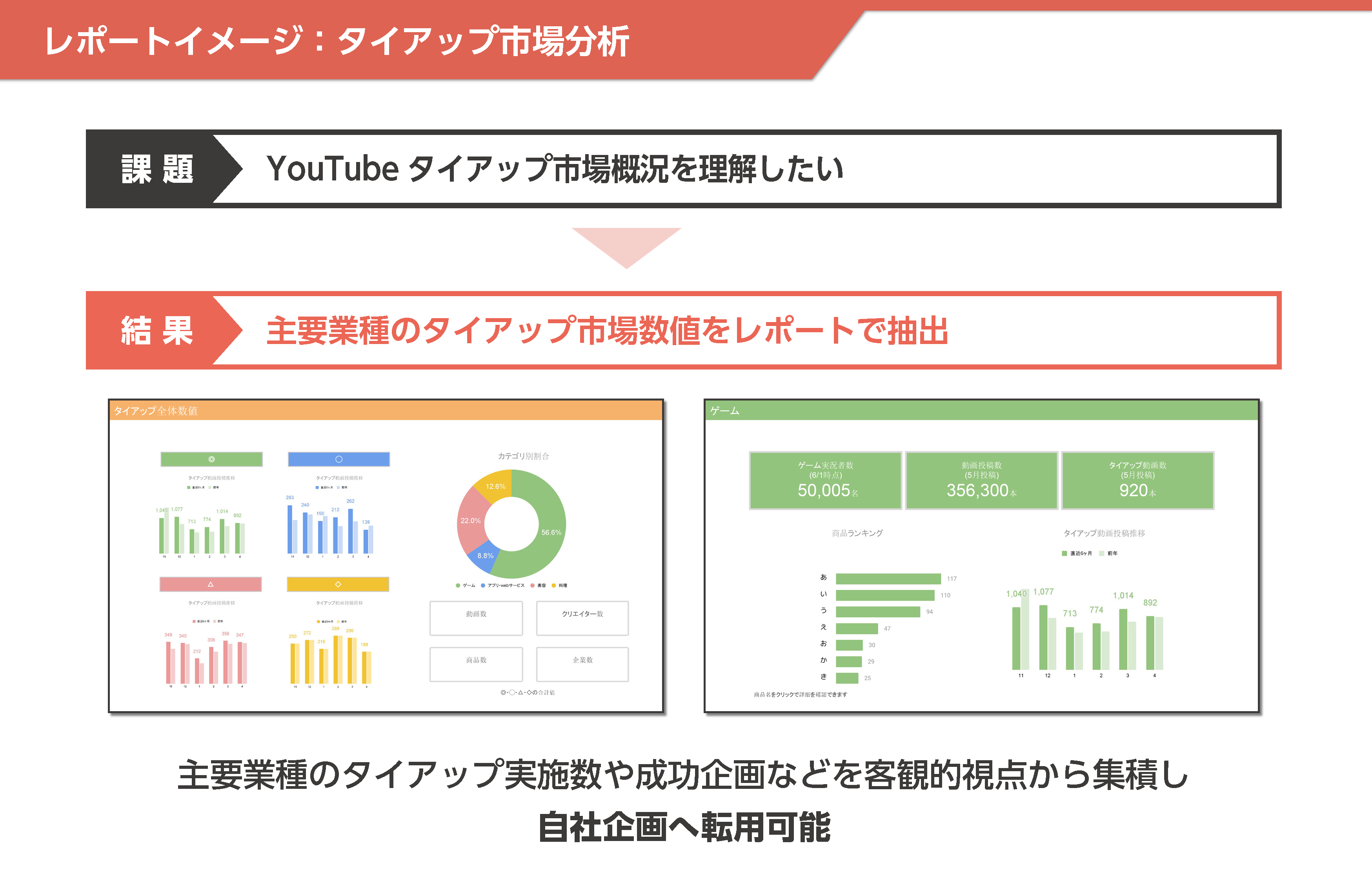 各業種のYouTuberタイアップ案件実施数や、視聴回数が伸びていて実際に認知拡大や購買に繋がっている企画などのデータを集積し、運用するYouTubeチャンネル企画へ転用が可能です。また、現在のYouTubeタイアップ市場概況を理解したいというニーズをお持ちの方にもおすすめです。