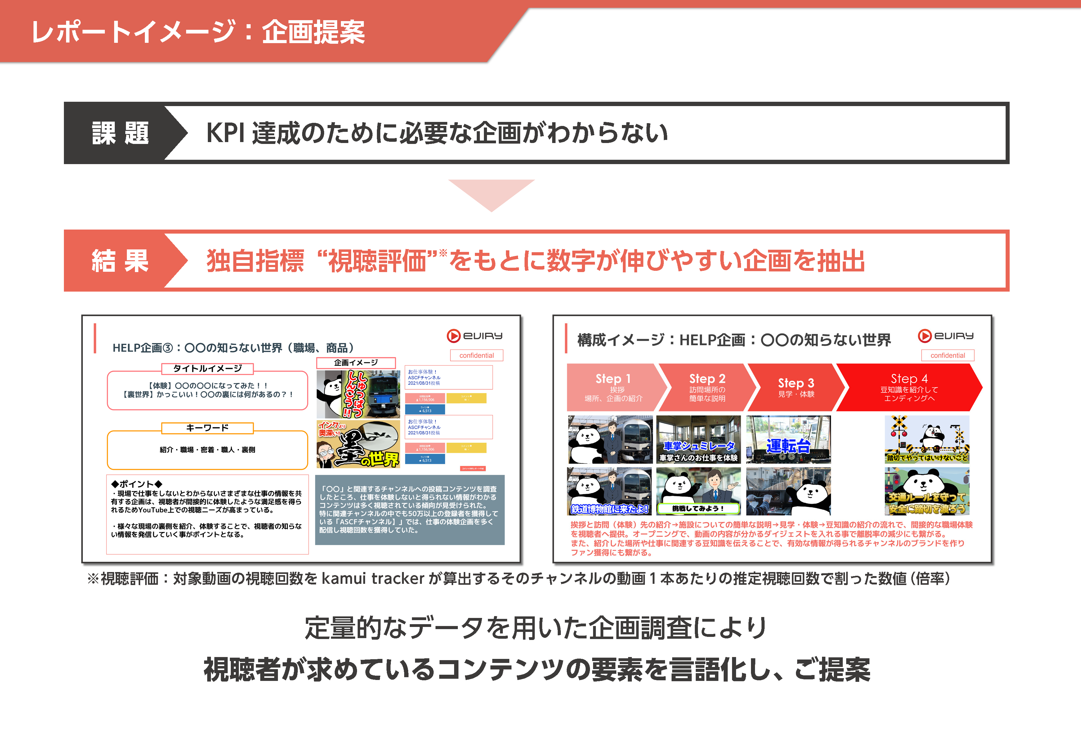 また、KPI達成のために必要な企画がわからない場合、『kamui tracker』の独自指標である視聴評価(※)をもとに数字が伸びやすい企画を抽出します。