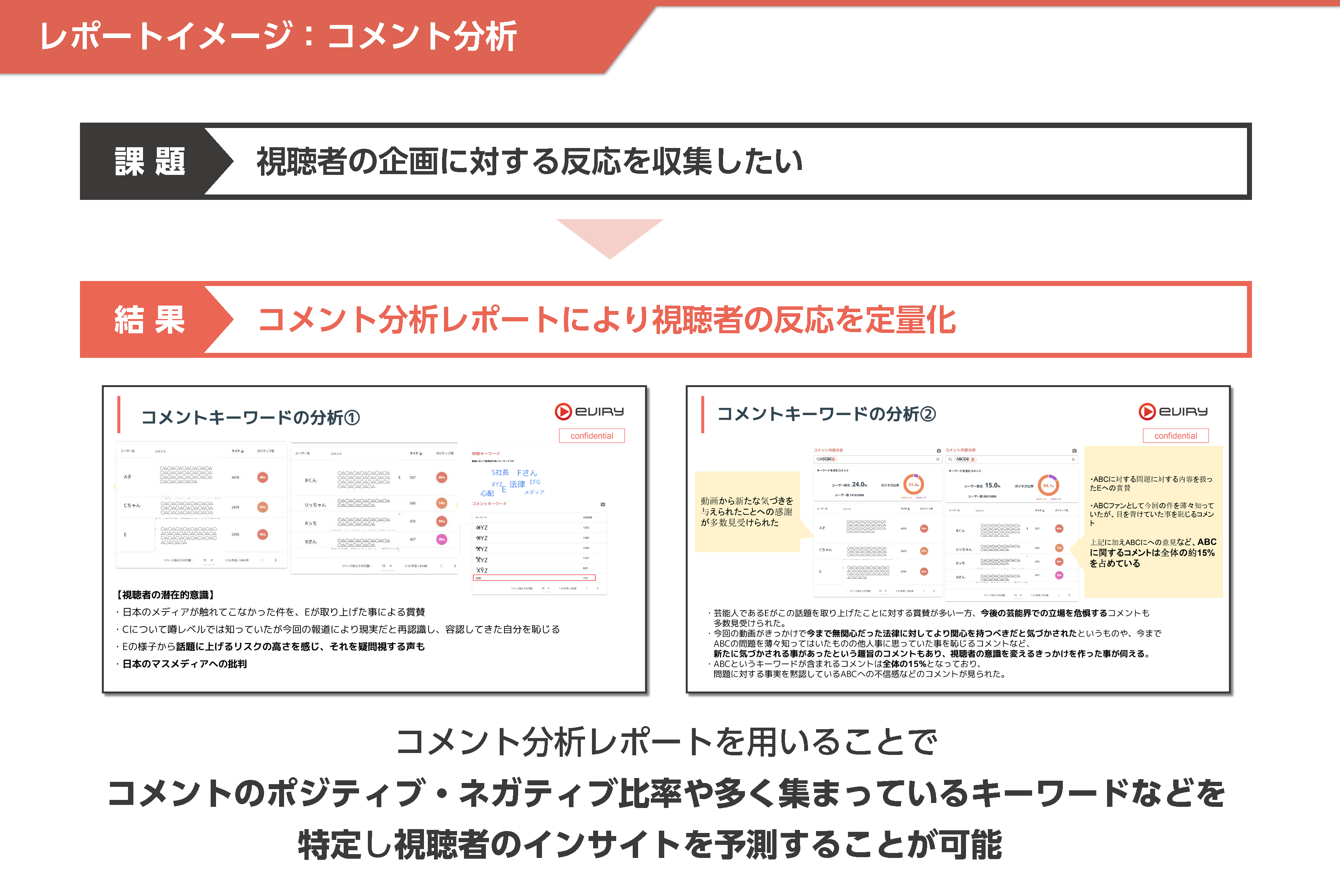 『kamui tracker』のコメント分析機能を利用した「コメント分析レポート」では、コメントのポジティブ・ネガティブ比率や動画に多く集まっているキーワードなどを特定し詳細を分析することで、視聴者の企画に対する反応を定量化することが可能です。