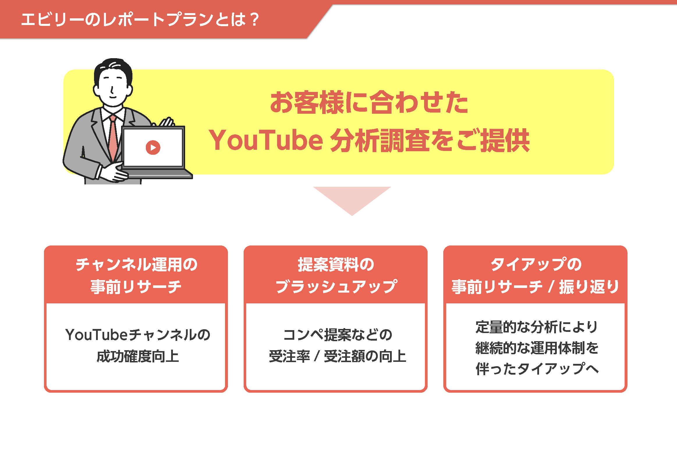 お客様のご要望やご状況に合わせてYouTube市場の分析調査を行い、そのデータに基づいた情報をご提供するプランです。