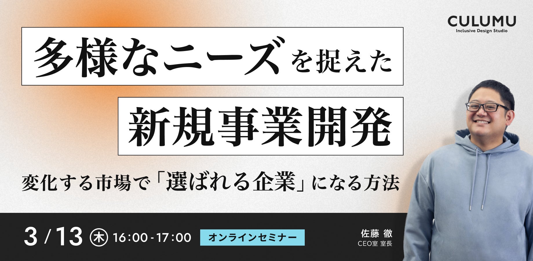 株式会社STYZ(東京都渋谷区、田中辰也 代表取締役社長)は、当社内で運営するインクルーシブデザインスタジオCULUMU主催のオンラインセミナーを2025年3月13日(木)16時から開催します。
