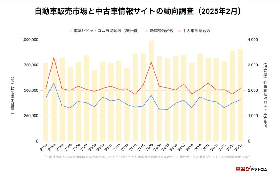 株式会社ファブリカホールディングス(本社:東京都港区、代表取締役社長CEO:谷口政人)の完全子会社、株式会社ファブリカコミュニケーションズ(本社所在地:愛知県名古屋市中区、代表取締役社⻑CEO:⾕⼝ 政⼈)が運営する中古⾞情報サイト「⾞選びドットコム(https://www.kurumaerabi.com/)」より、2025年02⽉における⾃動⾞登録台数の推移と、中古⾞情報サイト「⾞選びドットコム」の販売台数推移から、中古⾞市場の動きをまとめたレポートをご案内いたします。