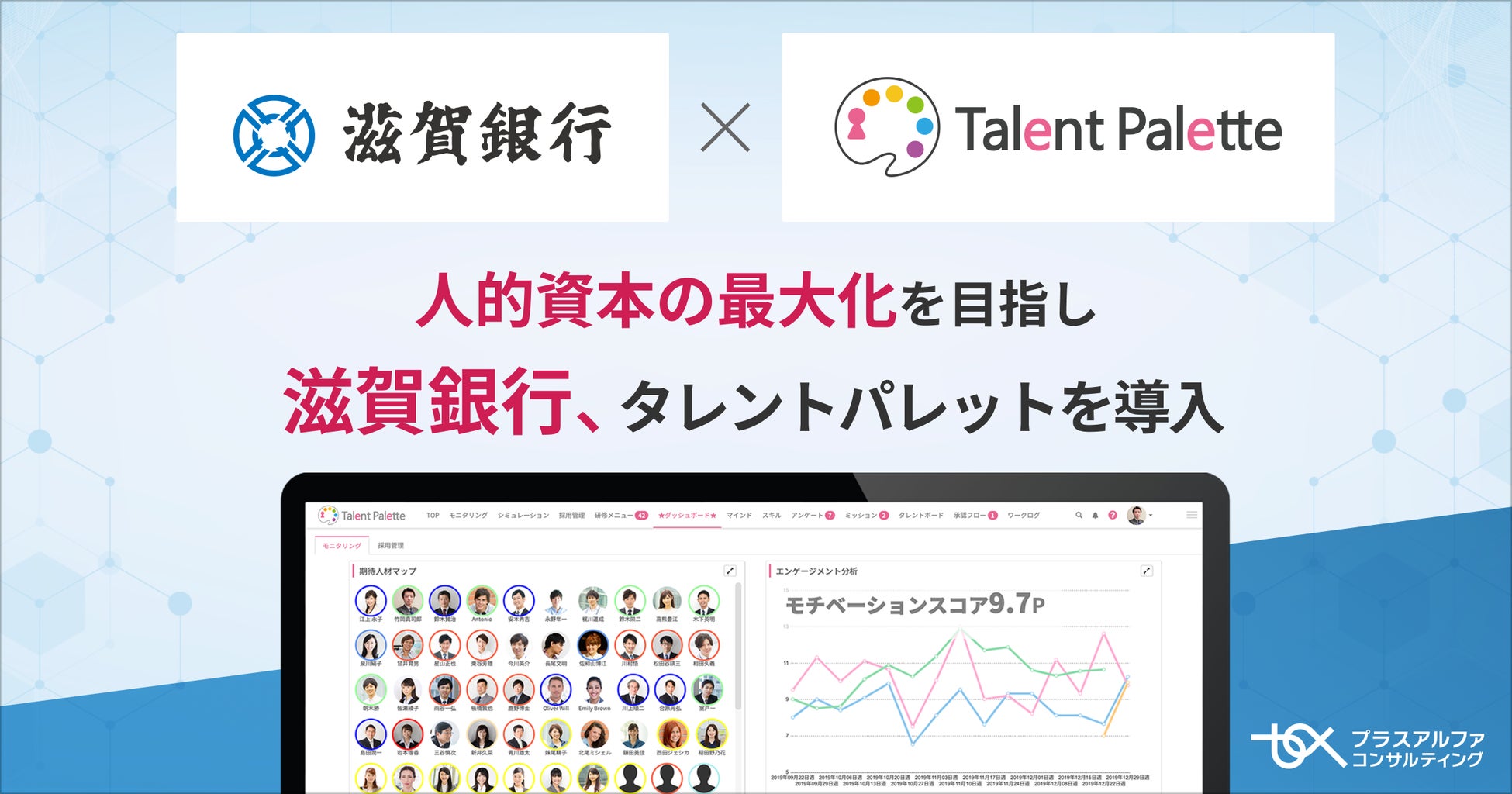 株式会社プラスアルファ・コンサルティング(本社:東京都港区、代表取締役社長:三室克哉 証券コード:4071)は、データに基づく人材活用や人的資本の開示、人事業務のDX化、リスキリングの推進などを目的に多くの大手企業で導入が進んでいるタレントマネジメントシステム「Talent Palette(以下:タレントパレット)」を、株式会社 滋賀銀行(本店:滋賀県大津市、代表取締役頭取:久保田 真也、以下:滋賀銀行)に導入いただきましたことをお知らせいたします。
