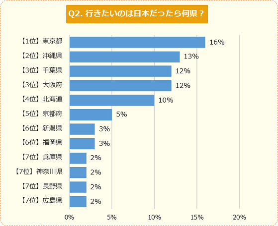 旅行に行きたい都道府県は、1位が東京都、2位が沖縄県、3位が千葉県・大阪府となりました。