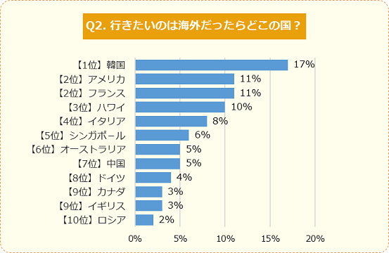 行きたい国は、1位「韓国」、2位「アメリカ」、3位「フランス」という結果でした。