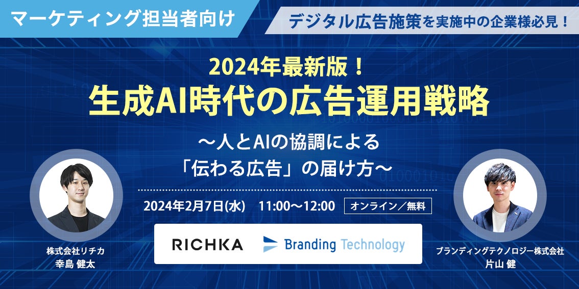 株式会社リチカ(本社:東京都渋谷区、代表取締役:松尾幸治 以下、当社)は、 ブランディングテクノロジー株式会社(本社:東京都渋谷区、代表取締役:木村 裕紀 以下、ブランディングテクノロジー社)と「生成AI時代の広告運用戦略 〜人とAIの協調による伝わる広告の届け方〜」のセミナー(以下、本セミナー)を2024年2月7日に開催します。
