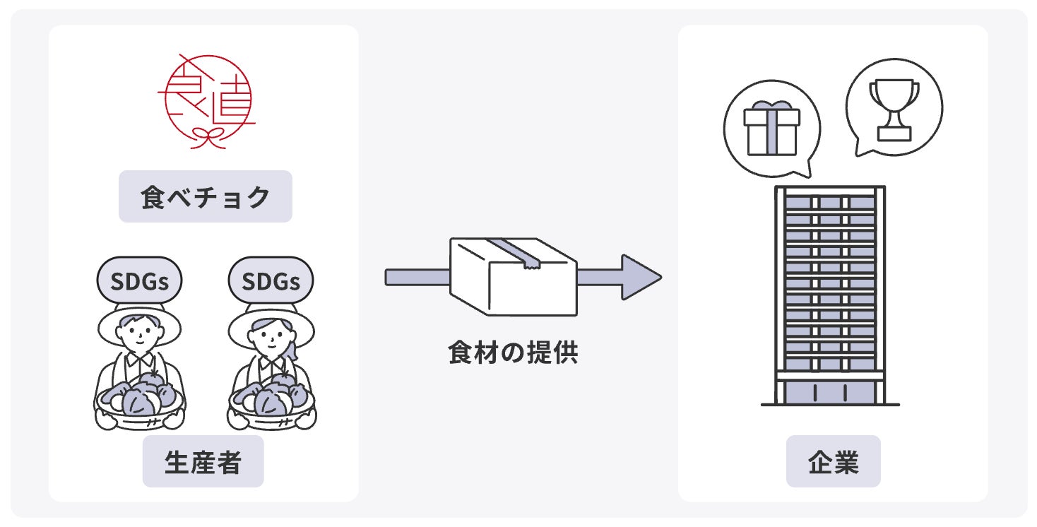 プラスチックをできるだけ使わず梱包をしている生産者の食材や、形や大きさが不揃いでも味は変わらない規格外食材などを企業へ提供します。顧客向けの販促施策や従業員向け福利厚生、法人ギフトなどでの活用を促進することでSDGsへの貢献を果たします。