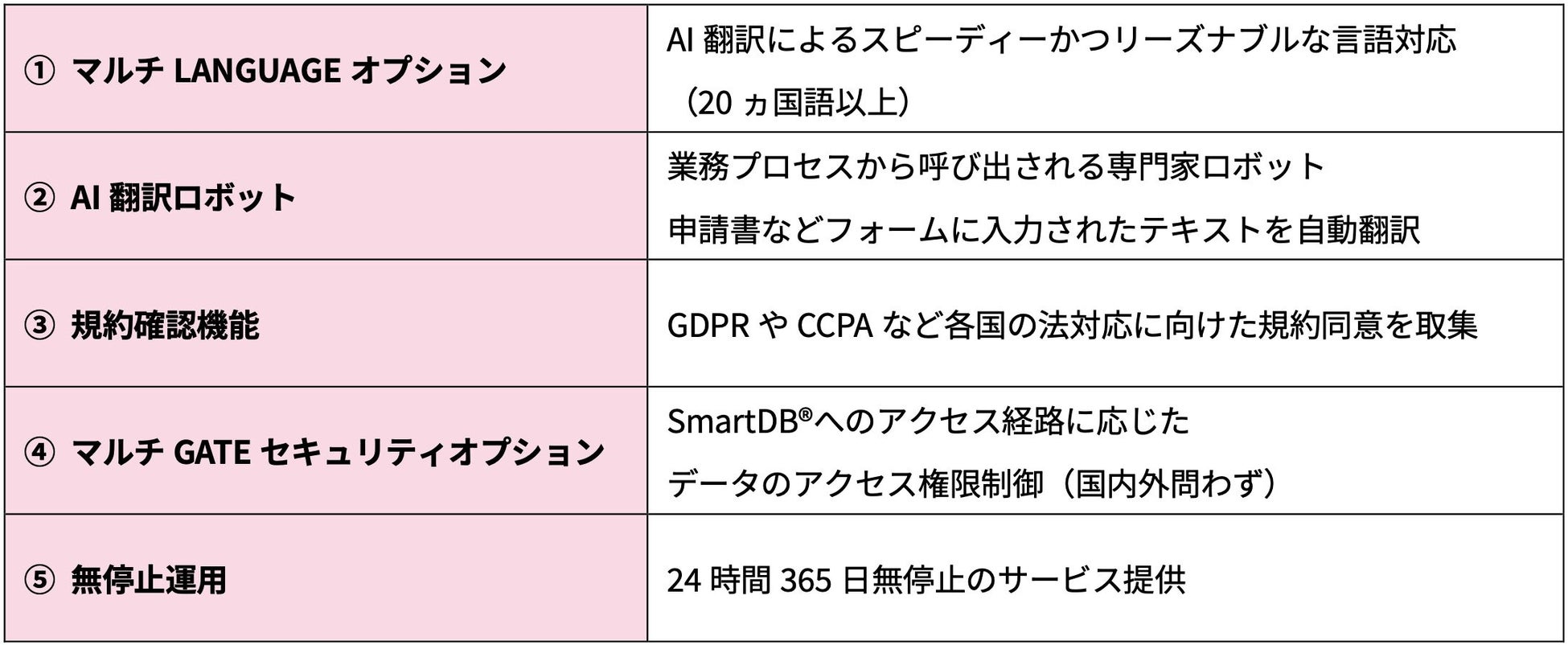 前述の経営課題に対して、ドリーム・アーツは日本企業のグローバル市場での競争力強化・持続的な成長を支えるために、SmartDB(R)を主軸とした海外DXの支援ソリューションを展開していきます。 具体的にはAI翻訳ロボットや現地の法対応、各拠点のアクセスコントロールなど、特定のエリアに限らず事業戦略において重要となる国や地域でのサービス活用を前提に、日本で整備された業務オペレーションの海外への展開を支援してまいります。