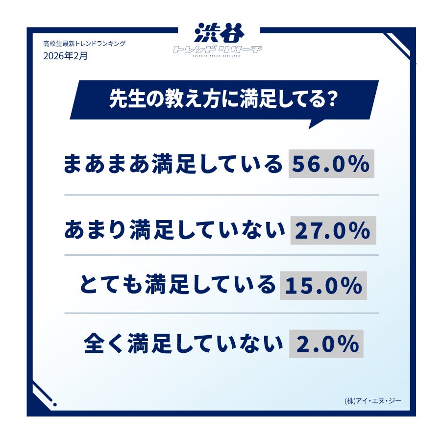 「先生の教え方の満足度」を聞いたところ、半数を超える83.0%が「とても満足している」「まあまあ満足している」と回答する結果となりました。満足している生徒からは、「授業が面白く、質問にも丁寧に対応してくれる」(高3・男子)、「具体的な資料や教科書に載っていない情報を提供してくれるので、イメージが湧きやすく理解が深まる」(高3・男子)といったエピソードが寄せられました。先生独自の工夫が、生徒の学習意欲に直結している様子がうかがえます。一方で、「先生によって差が激しい。どこを解説しているのか不明確だったり、字が読めなかったり、すべてタブレット任せの先生もいる。その反面、丁寧に補習をしてくれる先生もいる」(高1・女子)や「数学などの難解な授業で、独り言のように喋っていて理解できない」(高2・男子)など、教え方の質にバラつきがあることへの不満の声も挙がる結果となりました。